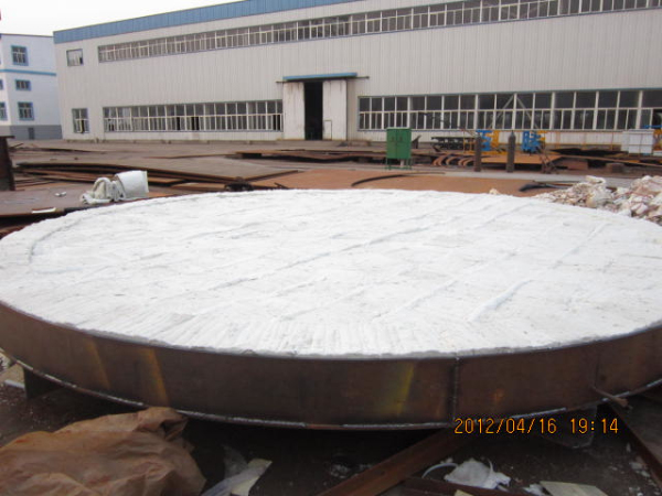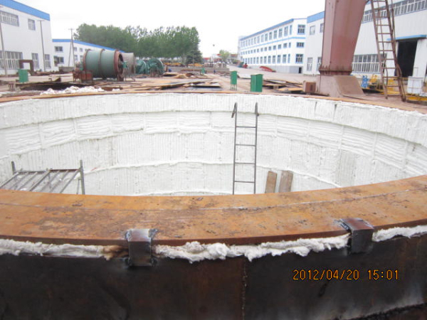 ● 井式滲碳爐耐火保溫爐墻部分:總保溫厚度為300mm,由熱面到冷面依次為陶瓷纖維折疊塊+層鋪毯的復(fù)合爐襯結(jié)構(gòu),其中折疊塊厚度為270mm,材質(zhì)為高純型;背襯層由二層厚度為20mm纖維毯壓縮到30mm。