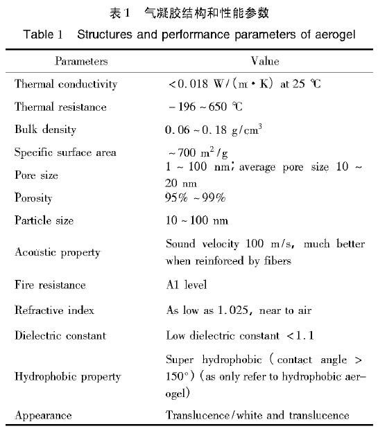 氣凝膠按組分可分為氧化物氣凝膠、有機氣凝膠、炭/石墨烯氣凝膠、碳化物氣凝膠、硫族氣凝膠以及金屬氣凝膠等。氣凝膠材料具備很低的密度, 2013 年報道了密度低至0.16 mg/cm'的很彈性全碳氣凝膠, 2014年報:道了密度低至0.12mg/cm的很彈性多功能化的三維納米纖維氣凝膠 。氣凝膠材料也是世界上熱導率較低的固體材料,其室溫熱導率低于100 kPa、20 C干空氣的熱導率(0.025 W/(m. K)),被稱為絕熱材料。除此以外,氣凝膠材料還具備高孔隙率、高比表面積、低折射率、低介電常數等特性,表現出優異的光學、熱學、聲學、電學特性(表1),在工業保溫、建筑節能、航空 航天、化工冶金、環境治理等領域展現出很大的應用價值和廣闊的應用前景 。2017年10月,Market Re-search.biz的研究報告指出:2016年全球氣凝膠市場價值為5.129億美元,2017 ~ 2026年復合年增長率預計為31. 8%,2026年全球氣凝膠市場價值將達到80. 837億美元。本文即主要對二氧化硅基氣凝膠和有機氣凝膠的發展進行了論述,同時介紹了氣凝膠在絕熱和吸附領域的研究進展。