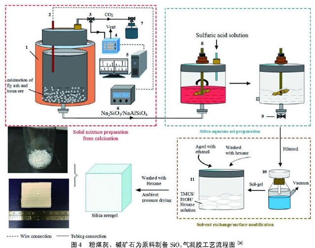 疏水SiO2氣凝膠的制備主要有3種方法:蒸汽后處理法、共前驅體法以及表面烷基化法,3種方式的核心均是將氣凝膠表面的親水基團轉化為疏水基團。其中蒸汽后處理法就是將濕凝膠置于甲醇蒸汽中,然后將其表面的Si-OH結構轉變為Si-0CH3結構,從而實現疏水改性。蒸汽后處理法一般仍采用TEOS或者TMOS作為前驅體材料,甲醇蒸汽溫度為220~ 240 C,改性時間為10~40h20。共前驅體法主要是采用含有部分不可水解基團的有機硅氧烷對常用的TEOS或者TMOS進行部分替代,進行共水解-縮聚反應,然后通過后期的很臨界干燥過程得以實現。由于不可水解側鏈基團的存在,采用共水解法制備的樣品一般具備更低的密度、較差的透明度,而疏水性能顯著提升。較常見的共水解劑包括甲基三甲氧基硅烷、乙基三甲氧基硅烷、正丙基三甲氧基硅烷、正丁基三甲氧基硅烷、乙烯基三甲氧基硅烷等。Li等以 正丙基三乙氧基硅烷為共水解劑,經常壓干燥制備了接觸角高達153的疏水氣凝膠,同時該氣凝膠的彈性模量顯著提升(0.21 MPa到0.35 MPa)。Yu等2也采用共前驅體法結合CO2很臨界干燥對于疏水SiO2氣凝膠進行了研究,該氣凝膠接觸角為152,疏水溫度達450 C。表面烷基化法就是采用三甲基氯硅烷(TMCS)、六甲基二硅 氮烷(HDMS)等疏水改性劑,對于濕凝膠進行表面改性,將其表面的Si-0H轉化為疏水的0Si-CH結構。Jeong等嗎以TEOS為硅源,其濕凝膠經TMCS疏水改性后,制備的氣凝膠接觸角高達143%。其他研究人員D4對于TEOS形成的濕凝膠結構采用HDMS進行疏水改性。2.3低成本Si02氣凝膠 低成本制備改性Si02氣凝膠材料主要從兩方面入手,一是采用價格低廉的水玻璃、粉煤灰、稻殼灰、礦渣等原料替代價格高昂的有機金屬醇鹽;二是采用低成本的常壓干燥技術取代很臨界干燥技術。由于常壓干燥技術中往往需要引入疏水改性劑,因此在這一過程中同時也實現了對SiO2氣凝膠的疏水改性。Cheng 等 23以粉煤灰為原料,采用堿激發法結合常壓干燥制備了低成本SiO2氣凝膠。該氣凝膠的密度為0.085g/cm3, 比表面積高達700m21g,接觸角為140%, 疏水溫度達360℃。Wu等 26以粉煤灰和堿礦石為原料,經固相煅燒、酸溶、表面改性、除雜、常壓干燥等過程制備了低成本SiO2氣凝膠(圖4)。該氣凝膠的接觸角高達151°,疏水溫度可保持至476℃。Feng 等27以稻殼灰為原料,經常壓干燥制備了低成本SiO2氣凝膠。該氣凝膠比表面積較高可達 400℃。Pan 等網以水玻璃為原料,經常壓干燥在4h內成功制備了低成本疏水Si02氣凝膠顆粒,其顆粒粒徑在20 nm左右,接觸角高達162%。