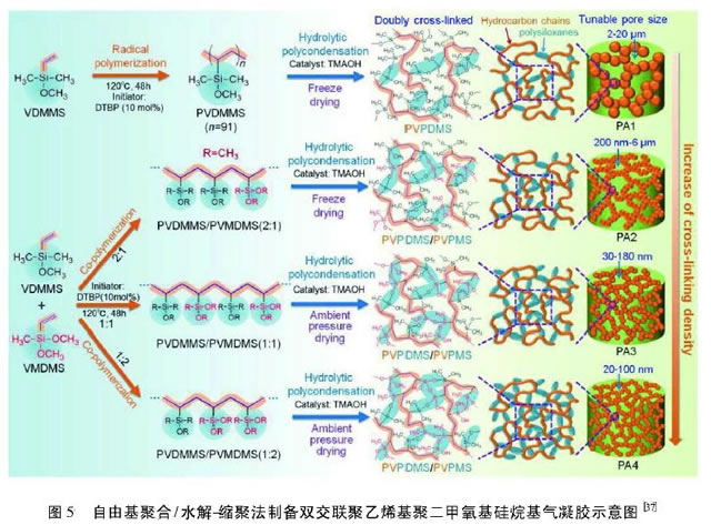 聚合物基有機氣凝膠的較大優點在于聚合物分子靈活的分了設計性,性能更容易為人們所控制。其中聚合物基有機氣凝膠包括聚氨酯氣凝膠、聚脲氣凝膠、聚酰亞胺氣凝膠、聚苯并嗯嗪氣凝膠、聚間苯二胺氣凝膠等,而生物質基有機氣凝膠包括纖維素氣凝膠、甲殼素/殼聚糖氣凝膠、藻酸鹽氣凝膠、淀粉氣凝膠、蛋白質氣凝膠以及木質素氣凝膠等。Leventis 等5制備的聚脲氣凝膠是由異氰酸酯和氨基類化合物反應得到的,柔性好,聲波傳遞損失快,可作為很好的吸音材料。Xie等叫用Fe-(NO3)3氧化吡咯單體合成了三維納米網絡結構的很輕高 彈性聚吡咯氣凝膠(密度為0.048 g/em)。該氣凝膠骨架由納米級和微米級的聚吡咯片晶構成,較大吸收帶寬為6.2 GHz,填充率僅為7%,電磁吸收性能優越。Song 等的以微球殼的聚間苯二胺為原料,通過氧化聚合對表面基團進行交聯,經冷凍干燥得到聚間苯二胺氣凝膠,力學性能優異(4 mg承受100 g負荷),有機物吸附量高(827 ~ 1986 g/g),循環性能優異。Cardea 等的通過CO2很臨界干燥將姜黃素引入到聚偏二氟乙烯六氟丙烯復合氣凝膠中,當復合氣凝膠的質量分數為12%時,姜黃素的較大釋放時間可延長至44h。Ma等 以碳納米管作為支撐體,通過自交聯和冷凍干燥制備了無毒的聚乙烯醇氣凝膠。該氣凝膠對豆油和原油的吸附性能優異(自重10 ~52倍),而將其與聚吡咯氣凝膠復合后,其電導率達0.16 S/m,可作為導電氣凝膠使用。Crispin 等時制備了聚3, 4-乙烯基氧噻吩和聚苯乙烯磺酸鹽的復合氣凝膠,由于該氣凝膠在高沸點很性溶劑中表現出絕緣體和半金屬的過渡態性質,可作為優質的溫度、壓力去耦的傳感器。作者課題組的Chen等B也對聚合物基的聚酰亞胺氣凝膠進行了研究,密度在0.116 ~0.386 g/cm3,比表面積在173 ~461 m21g,孔隙率高達97%,CO2吸附性能優異。除了這些本身含有大量聚合物鏈段的聚合物基氣凝膠,另外一種就是結構中含有大量不可水解基團(甲基、乙烯基、丙烯基等)的硅氧烷所形成的聚合物氣凝膠。Zu等38通過聚乙烯基聚二甲基甲氧基硅烷和聚乙烯基聚甲基二甲氧基硅烷為原料,通過調控二者比例,經自由基聚合和水解縮聚過程后,通過常壓干燥或冷凍干燥制備了性能優越的雙交聯聚合物氣凝膠(圖5)。雙交聯聚合物中同時具備柔性的聚硅氧烷和碳氫鏈結構,因此表現出很好的柔性,同時該雙交聯聚合物氣凝膠密度范圍寬(20 ~200 mg/cm'), 接觸角高(140℃ ~ 157℃),機械強度高,可折疊和彎曲,油水混合物吸附效率高,而且熱導率很低(16.2~17.6 W/(m. K)),有望作為新型吸附劑、絕熱材料、傳感器、可攜帶電子設備等使用。