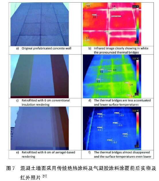 通過將顆粒狀的SiO2氣凝膠添加到水泥混凝土中,形成氣凝膠保溫砂漿與混凝土。成鎧等5制備了熱導率低至0.05 W/(m. K)、抗壓強度為0.52 MPa、線性收縮率為0.157%的氣凝膠保溫砂漿,各項技術指標高于國標要求。Wakili 等 將商業用氣凝膠砂漿用于德國某個1989年建造的30 m高建筑物的維修上,U值從傳統材料的1.0 W/(m2.K)降至0.3 W1(m2.K),而且氣凝膠砂漿涂覆后墻體縫隙處的熱橋消失(圖7),很好地起到了保溫絕熱的效果,同時實現了墻體透氣和防水,在惡劣條件下仍然具有很佳的應用價值。法國的Ibrahim等159將SiO2氣凝膠作為砂漿填充層,并通過預筑成型、機器噴涂或人工砌筑等方式用于建筑墻面保溫,結果表明砂漿密度為200 kg/m3時,比熱容為1100 kJ/(kg. K),熱導率低至0.027 W/(m . K)。Ng等ba將體積分數為50%的氣凝膠加入到高性能混凝土中,制備的氣凝膠混凝土抗壓強度為20MPa,熱導率為0.55 W/(m. K)。